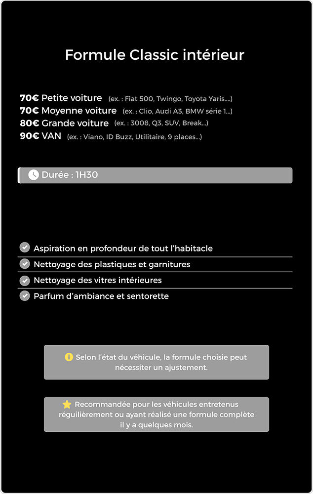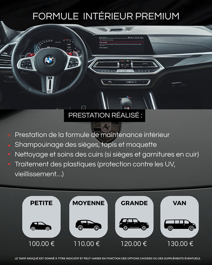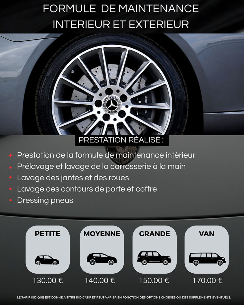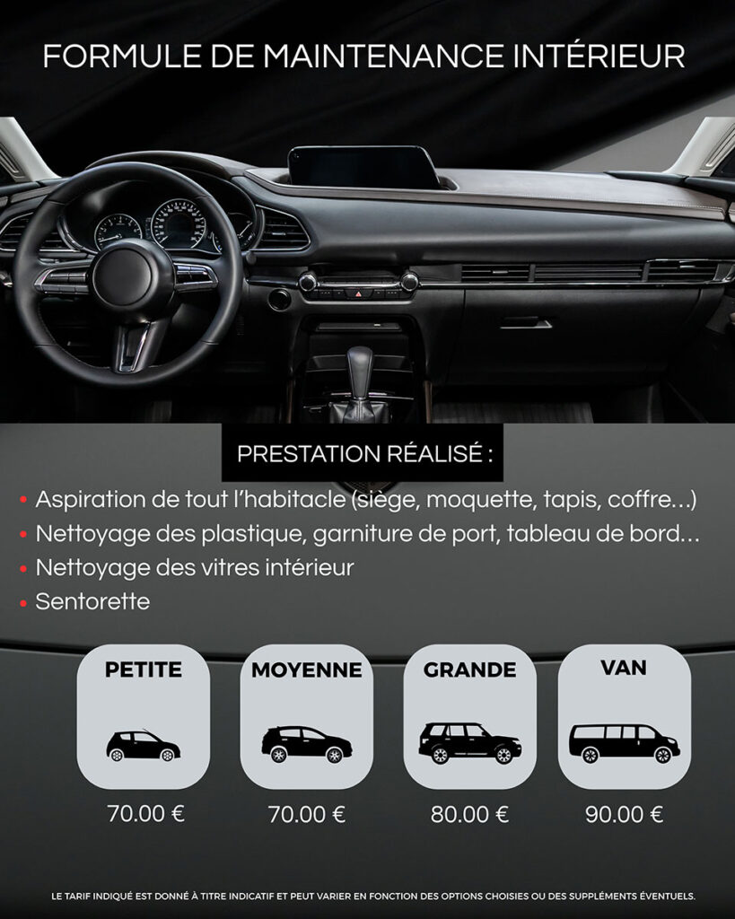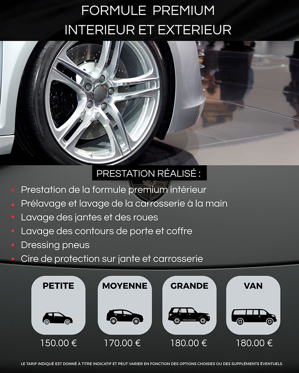 Nos experts s’occupent de tout, des sièges aux tapis, en passant par les moquettes, les portes, le tableau de bord, le volant et les consoles. Ne vous inquiétez pas, nous n’oublions pas l’extérieur de votre véhicule, la carrosserie est bien entendu la plus importante, mais les pare-chocs, les rétroviseurs, les joints et les autres pièces en plastique et en caoutchouc seront aussi nettoyés avec soin. Si besoin, nous allons également prendre le temps de laver les roues pour éliminer toute la saleté et la crasse.