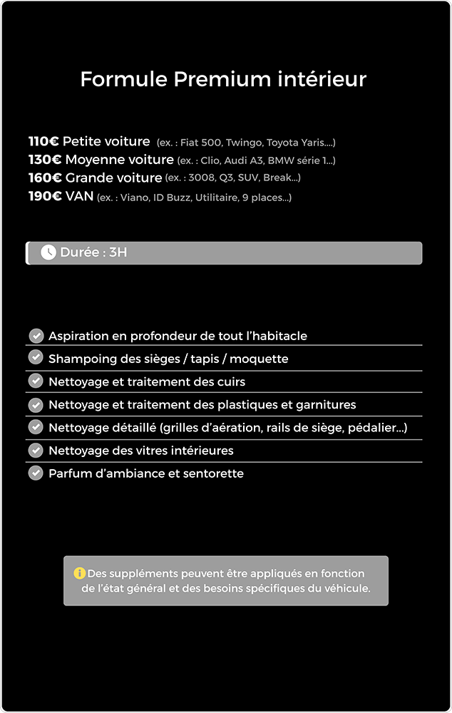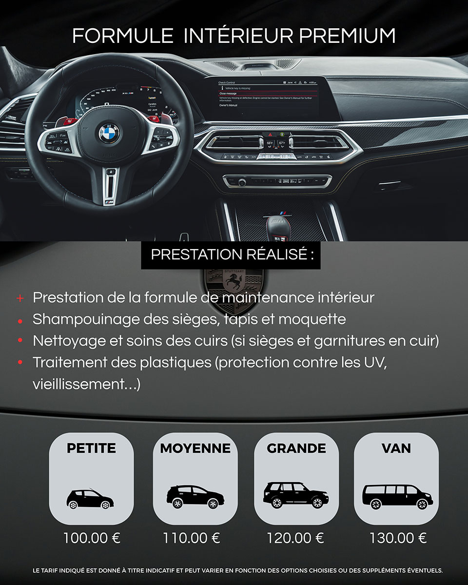 Notre formule Classic intérieur permet d’effectuer un nettoyage complet de l’intérieur de votre véhicule, dépoussiérage inclus. Le centre de lavage Badri Detailing vous offre le meilleur service possible, bien plus précis qu’un coup d’aspirateur en car wash, pour que votre voiture garde un aspect comme neuf même après de nombreuses utilisations ! Si vous avez besoin d’enlever les poils d’animaux, les taches ou tout autre élément de ce type, notre formule Premium intérieur est la solution idéale. Nous adapterons le nettoyage en fonction de vos besoins, le but est que votre voiture puisse être débarrassée de la saleté et des mauvaises odeurs, quelle qu’en soit l’origine.
