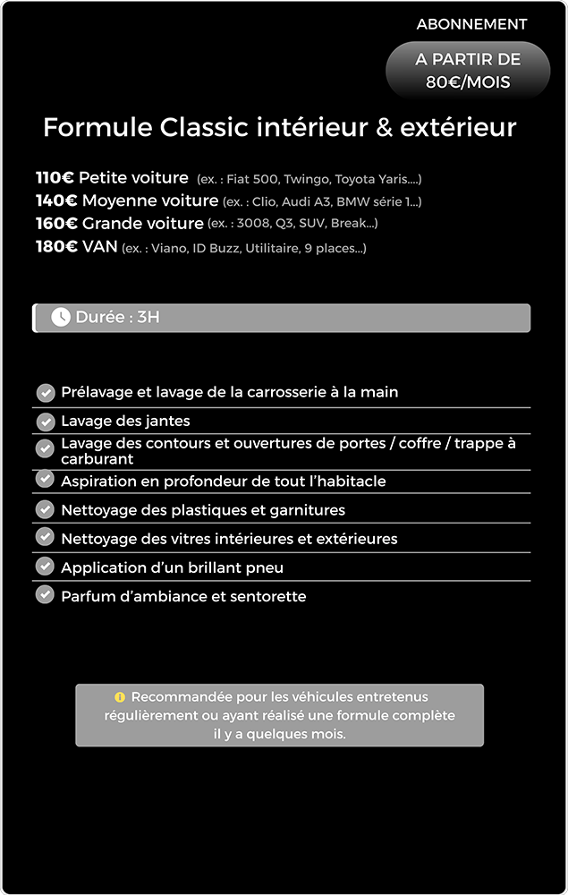 La durée du nettoyage extérieur peut varier entre une après-midi à plusieurs jours, tout dépend de la formule choisie, un lavage intérieur et un lavage extérieur peuvent être réalisés en simultané. Certaines étapes peuvent durer un peu plus longtemps, notamment si des rayures doivent être éliminées ou si un dégraissage doit être effectué. Nous avons différents forfaits selon votre budget et l’état de votre voiture !