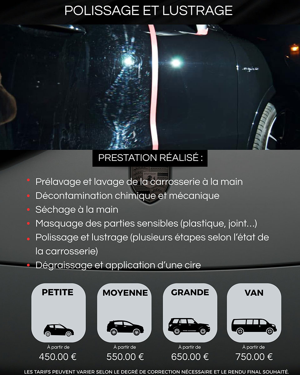 Le prix et la durée d’un polissage et d’un lustrage varient en fonction de la taille, de l’état de votre véhicule et du niveau de finition souhaité. Quels que soient la marque ou le type de voiture que vous désirez nous confier, nous saurons utiliser les bons produits et les bons outils pour la rendre encore plus belle. Nous sommes fiers d’offrir des services de polissage et de lustrage de la plus haute qualité en Haute-Savoie.